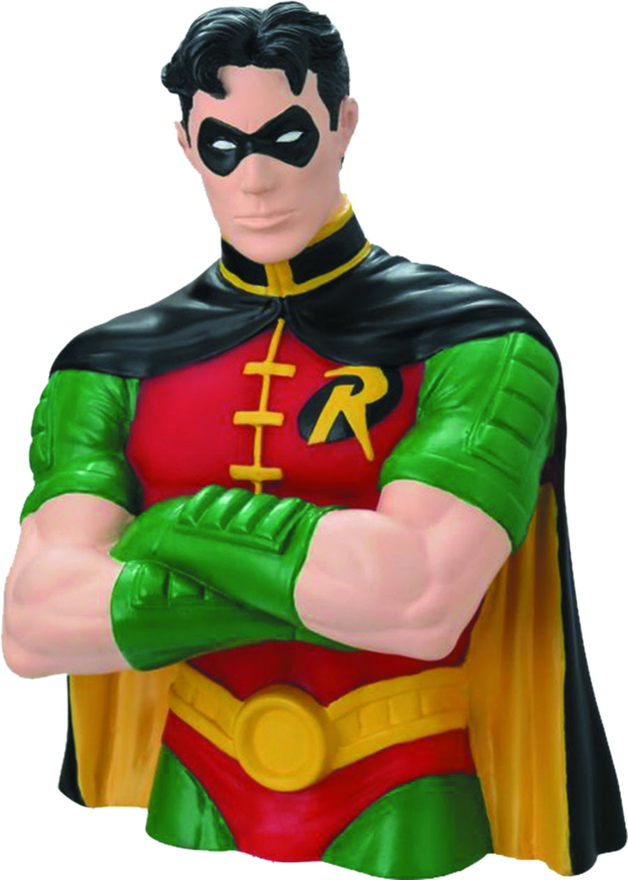 Batman's faithful sidekick confidently stands watch over your spare change as an 8" tall vinyl bust bank.